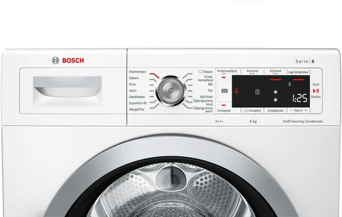 Bosch Wtw8756e Warmtepompdroger 8kg Bosch WTW8756ENL Warmtepompdroger – Stil, Energiezuinig en EfficiëntBeschrijvingDe Bosch WTW8756ENL warmtepompdroger is de perfecte keuze voor wie op zoek is naar een energiezuinige, stille en krachtige droogoplossing. Dankzij innovatieve technologieën zoals de SelfCleaning Condensor™ blijft de droger altijd extreem zuinig, terwijl je kleding zacht en efficiënt wordt gedroogd. De droger biedt een capaciteit van 8 kg, ideaal voor middelgrote tot grote huishoudens.Belangrijkste Kenmerken SelfCleaning Condensor™: Geen handmatig onderhoud nodig; behoudt de energieklasse A+++ gedurende de hele levensduur.AutoDry: Zorgt voor een zachte, gecontroleerde droogbeurt en voorkomt oververhitting van het wasgoed.AntiVibration Design: Vermindert trillingen en zorgt voor een stabiel en