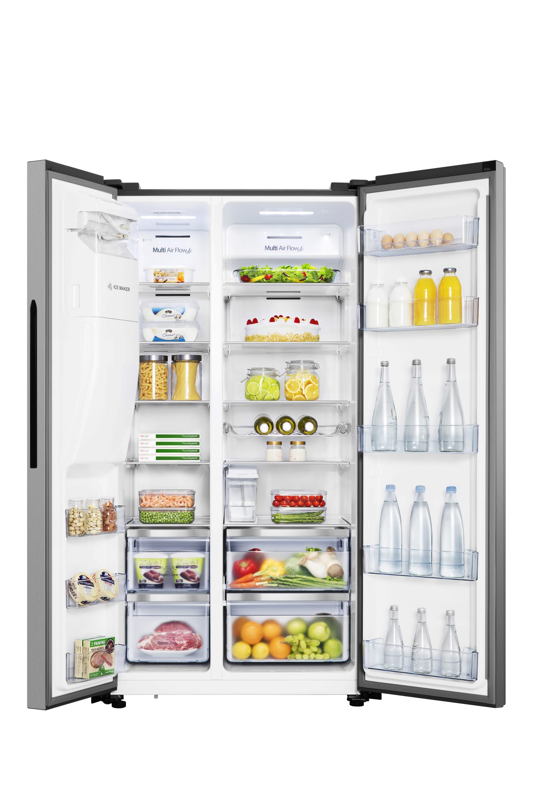 Hisense Rs694n4tcf Amerikaanse Koelkast 179cm De Hisense RS694N4TCF is een ruime en stijlvolle Amerikaanse koel-vriescombinatie met een royale inhoud van 635 liter. Dankzij de moderne RVS-afwerking, geïntegreerde water- en ijsdispenser en slimme functies zoals Total No Frost, Multi Air Flow en Super Freeze is dit model de ideale combinatie van design, comfort en prestaties.Belangrijkste kenmerkenTotale inhoud van 635 liter – 371L koelruimte en 191L vriesruimteTotal No Frost – Geen ijsvorming, nooit meer handmatig ontdooienMulti Air Flow-systeem – Gelijkmatige temperatuur in elke zoneWater- en ijsdispenser (met vaste aansluiting) – Altijd gekoeld water en ijsblokjes binnen handbereikSuper Freeze & Super Cool-functies –