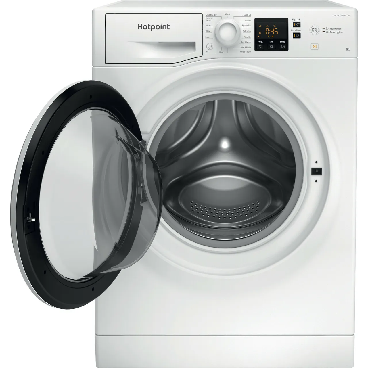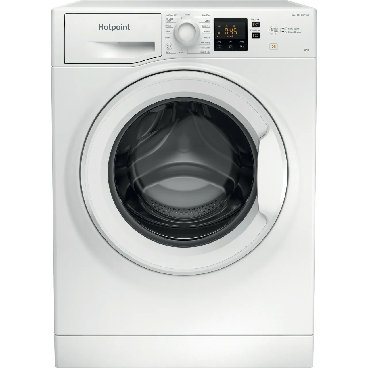Hotpoint Nswm846w – Wasmachine – 8 Kg – 1400 Tpm – Energieklasse A De Hotpoint NSWM846W Wasmachine is een vrijstaande wasmachine met 8 kg capaciteit en 1400 tpm centrifugeersnelheid. Deze witte wasmachine biedt geavanceerde technologieën, energiezuinigheid en een breed scala aan programma’s, ideaal voor middelgrote huishoudens die behoefte hebben aan een betrouwbare machine die grondige wasbeurten biedt, terwijl het energieverbruik beperkt blijft. De A-energielabel en centrifuge-efficiëntieklasse B maken het een uitstekende keuze voor gebruikers die zowel prestaties als energiezuinigheid waarderen.Ontwerp en GebruikersgemakDe Hotpoint NSWM846W heeft een eenvoudig en gebruiksvriendelijk ontwerp:Breedte: 59,5 cm, diepte: 60,5 cm, hoogte: 85,0 cm, wat zorgt voor een standaardafmeting die in